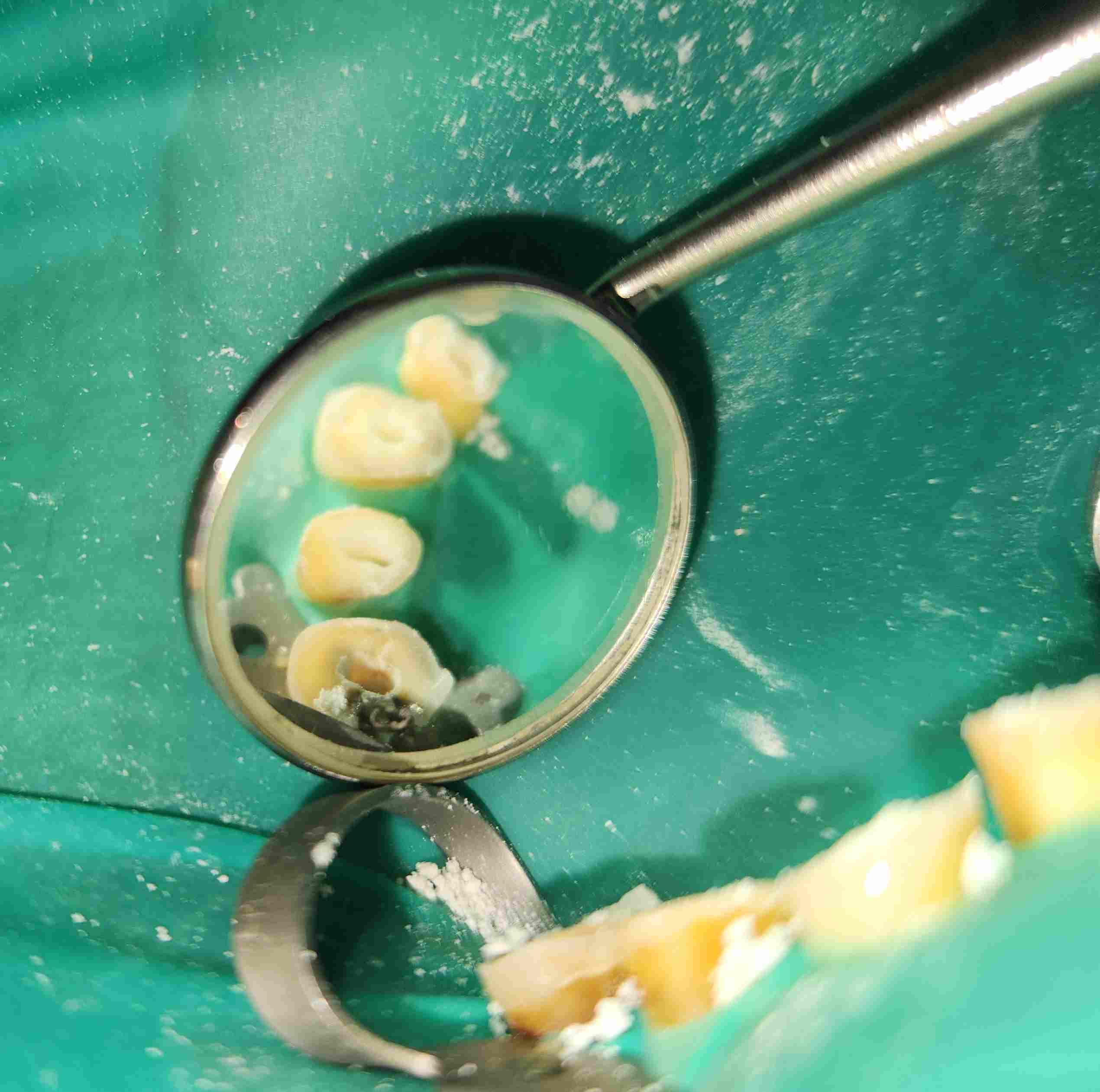 The advantage of keeping your own roots to support an overdenture is that it is already in your mouth. It is already bonded to your bone and you can use it immediately. We normally make the overdenture before the teeth are cut down. This then acts as a training denture which you can use to learn how to use the denture. If you have already had a root canal done on that tooth it will still be useable for supporting the denture. If you cut the crown off of the tooth and you do not hit the nerve then you may not even need extra treatment to use it. If the tooth is sensitive or when the crown is cut off and you hit the nerve, you will need to do a vital pulpotomy. Once the teeth are cut down and the denture modified to fit over the teeth we then add acrylic to the modified denture that flows around the roots of the tooth. As the acrylic sets it starts to become rubbery and eventually hardens just like the denture. While in the rubbery stage we tease the denture on and off of the teeth so that the denture does not lock onto the roots of the teeth. We want to be able to get it off and on so that the roots can be cleaned. Once the acrylic sets the denture will then snap on and off of the teeth so that the teeth act just like dental implants with snaps.