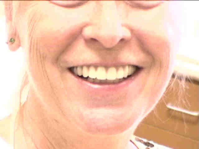 All of the teeth were broken off at the gum line. Snaps were placed in the roots and they secure the new teeth. Click here for a closer look at these overdentures.